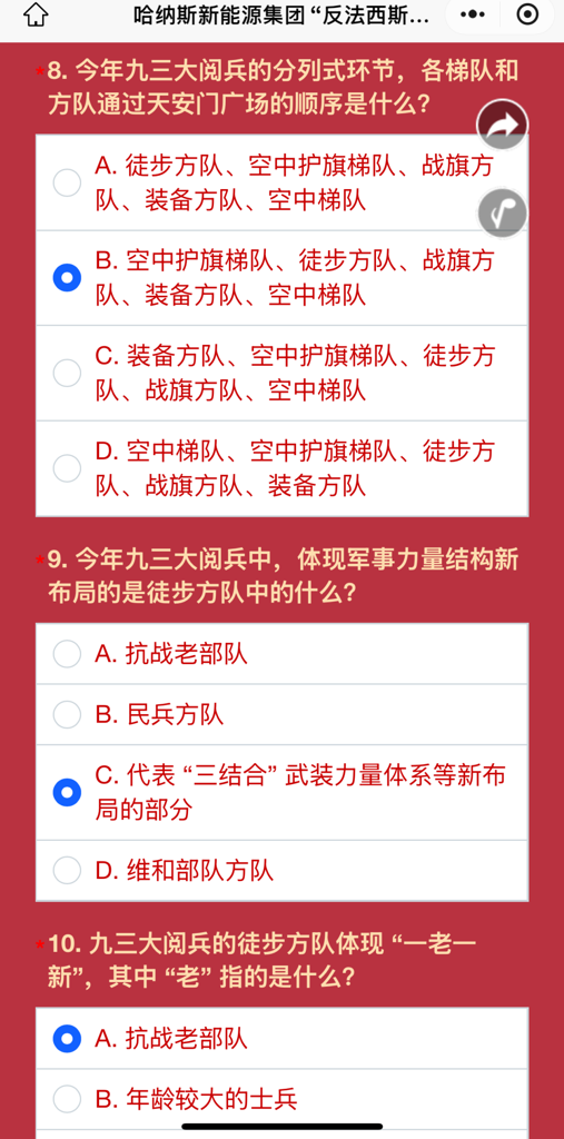 为深化主题教育,哈纳斯新能源集团策划开展了专题知识问答活动,围绕抗战历史、国际反法西斯战争及大阅兵等主题设置多道题目,号召员工积极参与线上答题,在重温历史的过程中进一步强化使命担当。