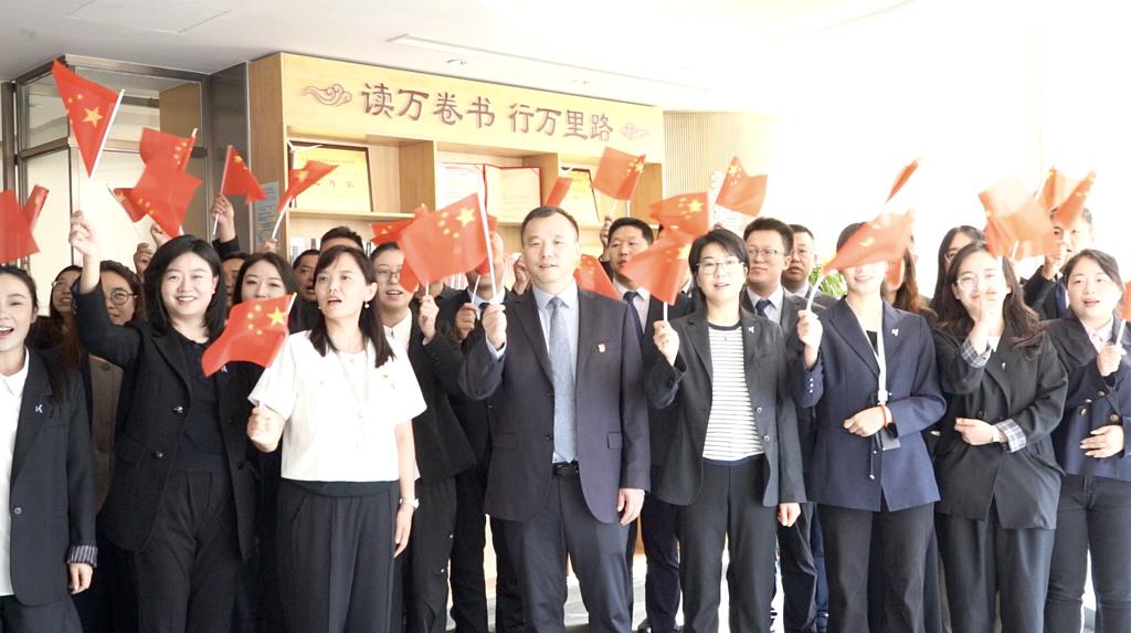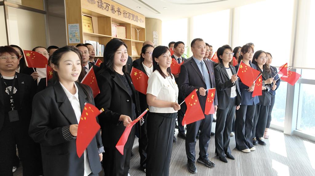 9月3日上午,在银工作人员身着正装,党员佩戴党徽,在图书角整齐列队。当《歌唱祖国》的激昂旋律响起,全体员工以铿锵有力的歌声唱响对祖国的深情祝福,一面面鲜艳的五星红旗在手中舞动,表达了对革命先烈的崇高敬意和深切缅怀。